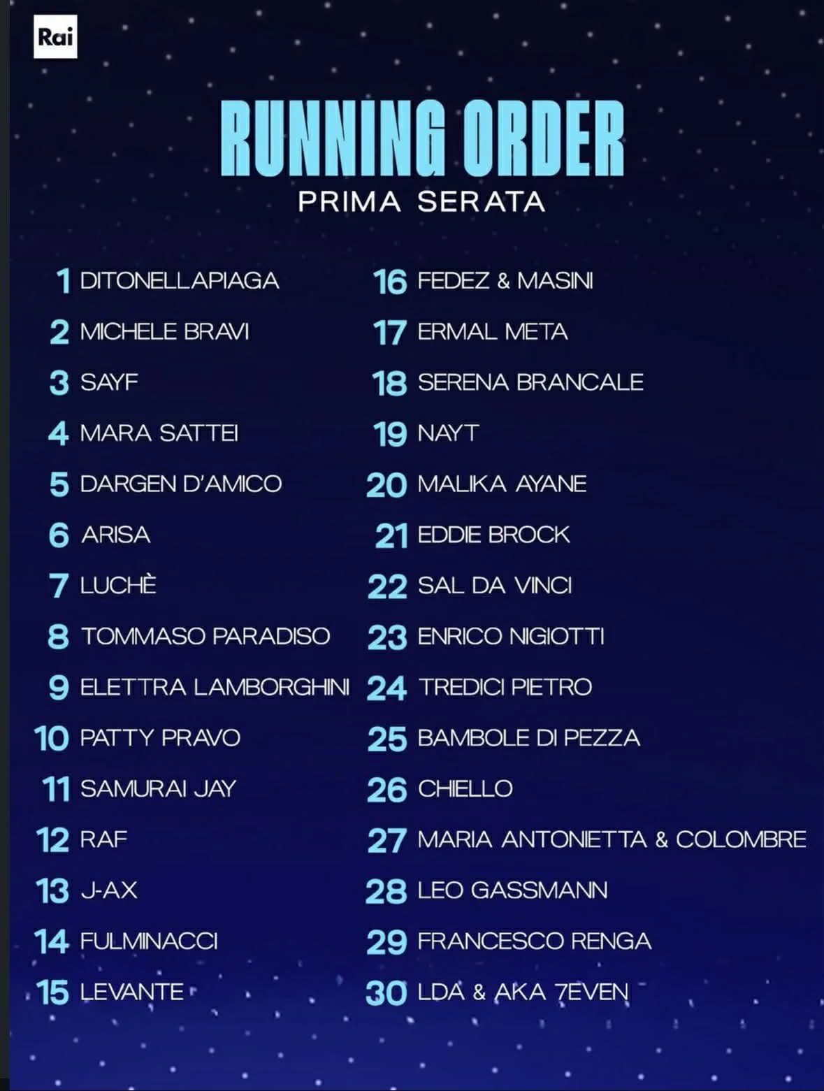 Vous pouvez retrouver sur la chaîne YouTube de la Rai, toutes les prestations de cette année : https://youtube.com/playlist?list=PLb_Qew9DujkgbCkDTnpKE0438t857DaPY&si=5pHTuUXSsofeLCW